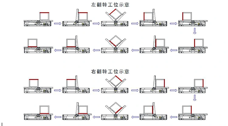 Dva kusy mobilných 180 ° hydraulických lúčov sa používajú na obrat pracovných kusov zváraných na jednej strane. When working, lift the work piece away from the roller table or work-piece rack, and the reducer drives the two beam flippers to move synchronously to move the work piece to the side of the roller table or work-piece rack, and then two hydraulic cylinders drive the two arms to rotate synchronously, move the work piece to the middle of the roller table or work-piece rack after overturning, and then transport the work piece to the next process or zváranie.